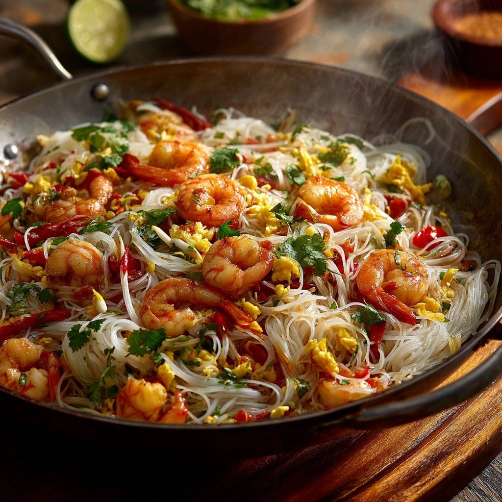 Stell dir vor, du ziehst die erste Gabel dieser glänzenden, fast durchsichtigen Nudeln aus der Schüssel. Sie sind elastisch, haben Biss und sind vollgesogen mit einer würzigen Sauce, die nach Fernweh schmeckt. Dazu kommen Garnelen, die beim Draufbeißen richtig knacken.