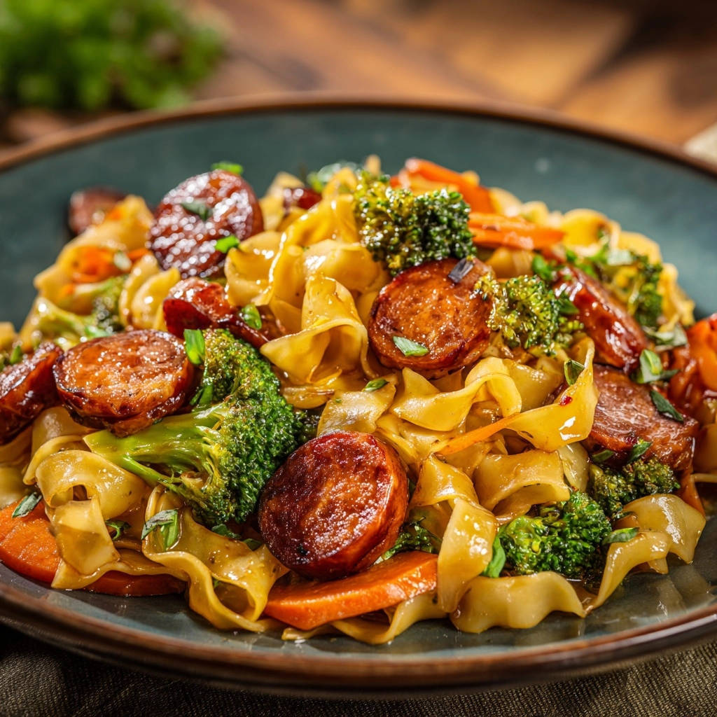 Serviere die Pfanne umgehend, um das volle Aroma und die perfekte Textur der knackigen Wurst, des bissfesten Gemüses und der nicht-klebenden Nudeln zu erleben.
