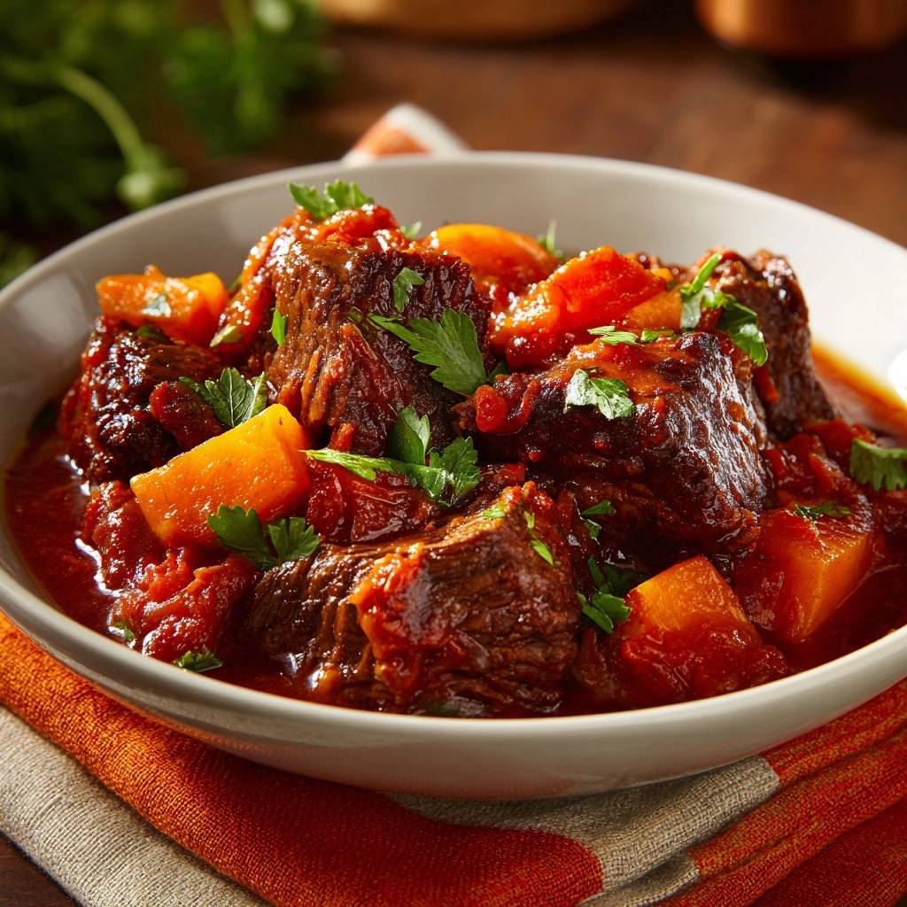 Der Duft steigt auf, als du den Deckel abnimmst: herzhaftes Rindfleisch, das förmlich zerfällt, umhüllt von süßem Kürbis und saftigen Tomaten. Du nimmst den ersten Bissen, und das Fleisch schmilzt im Mund, zart wie Butter. Das ist mein zartes Rindergulasch mit Kürbis, das perfekte Gericht für kühle Abende.