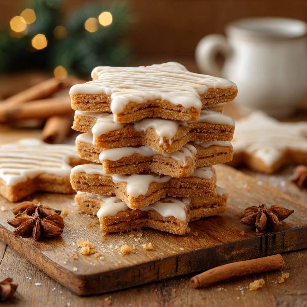 - Das Finish (Visuelle Perfektion): Rühren Sie den Puderzucker mit der Milch/Sahne und dem Zitronensaft glatt. Die Konsistenz muss sehr zähflüssig sein, damit sie nicht verläuft. Füllen Sie den Guss in einen Spritzbeutel mit kleiner Lochtülle oder einen Gefrierbeutel, bei dem Sie eine winzige Ecke abschneiden. Ziehen Sie den Guss in dichten, horizontalen Wellenlinien über die Sterne, sodass er an den Seiten leicht „heruntertropft“, wie auf dem Bild zu sehen. Lassen Sie den Guss vollständig trocknen, bevor Sie die Plätzchen stapeln.